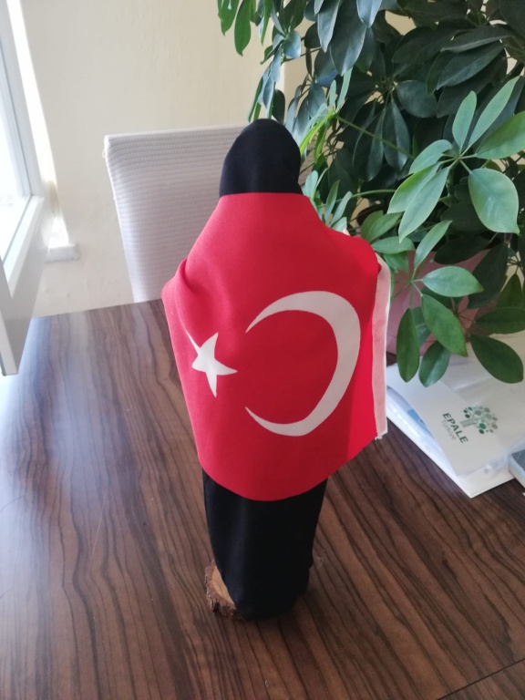 Pazarköy Müntaze Bilgin Köy Yaşam Merkezi kursiyerlerimiz ve el sanatları öğretmenimiz Özlem ÜNSAL, demokrasi zaferinin 9. yıl dönümünde 15 Temmuz'un hafızalarımıza kazınan fotoğraflarından sırtında Türk Bayraklı Yürüyen Kadın fotoğrafını kitre bebek olarak hazırladı.